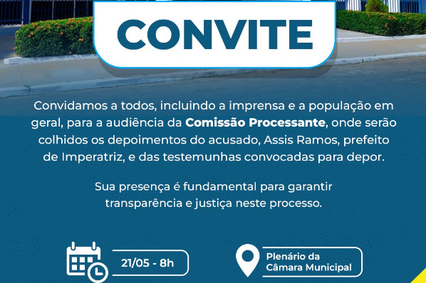 A Câmara Municipal de Imperatriz convida a todos os membros da imprensa e a comunidade em geral, para participarem da audiência da Comissão Processante da próxima terça-feira, às 8:00 da manhã, no Plenário da Câmara Municipal. Na ocasião, serão colhidos os depoimentos do acusado, Assis Ramos, prefeito de Imperatriz, bem como das testemunhas convocadas para depor. A sua presença é fundamental nesse momento.