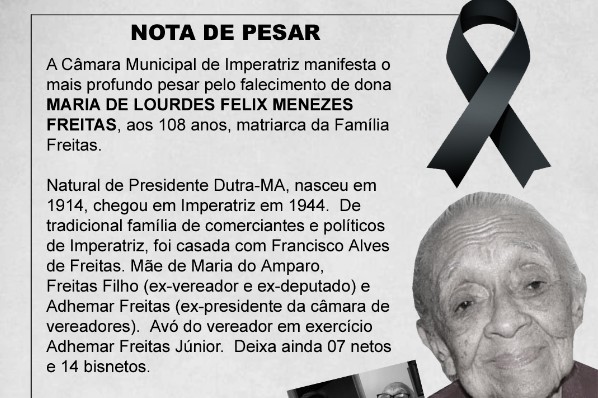 A Câmara Municipal de Imperatriz manifesta o mais profundo pesar pelo falecimento de dona MARIA DE LOURDES FELIX MENEZES FREITAS, aos 108 anos, matriarca da Família Freitas.