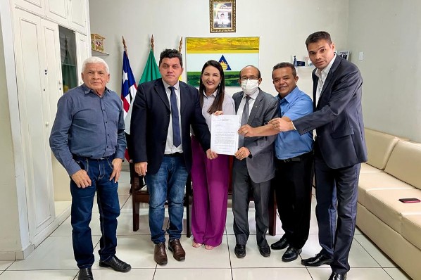 O presidente da Câmara Municipal, o vereador Alberto Sousa, junto com os vereadores Antônio Pimentel (DEM), Cláudia Batista (PTB), João Silva (MDB), Flamarion Amaral (PCdoB) receberam do Secretário de Administração e Modernização, Alex Silva (PL), o projeto de lei de autoria do executivo para reajuste de 10% sobre o salário-base dos servidores efetivos do cargo de Enfermeiro.